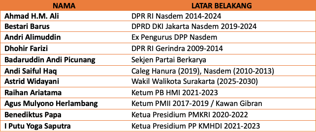 Dari sisi pengurus, dua elite Partai Nasdem memilih bergabung dengan PSI, yaitu Ahmad Ali yang pernah menjadi anggota DPR RI dari periode 2014-2024 dan Bestari Barus (mantan DPRD DKI Jakarta). PSI juga merekrut mantan tokoh mahasiswa dari HMI, PMII, PMKRI, dan KMHDI (lihat tabel )